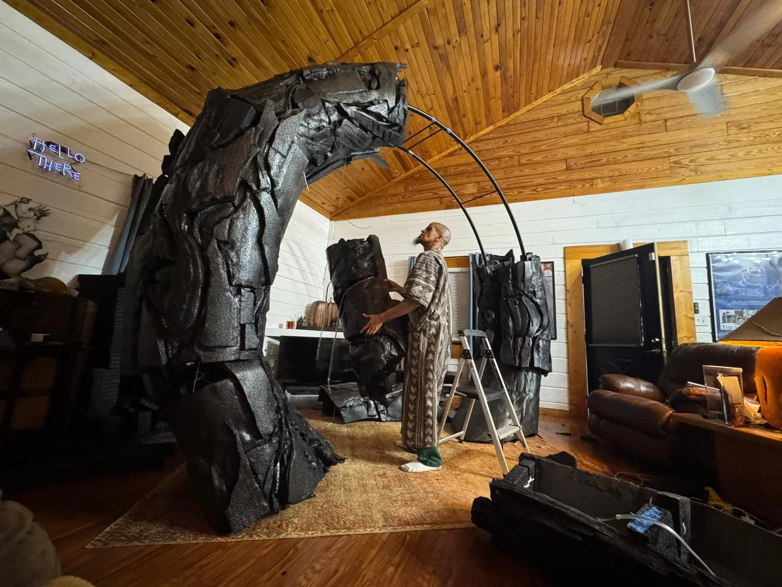 Assembling the South Gate in the living room, with 6’2” Rassera for scale. Ultimately the portal will be further raised on the platform.