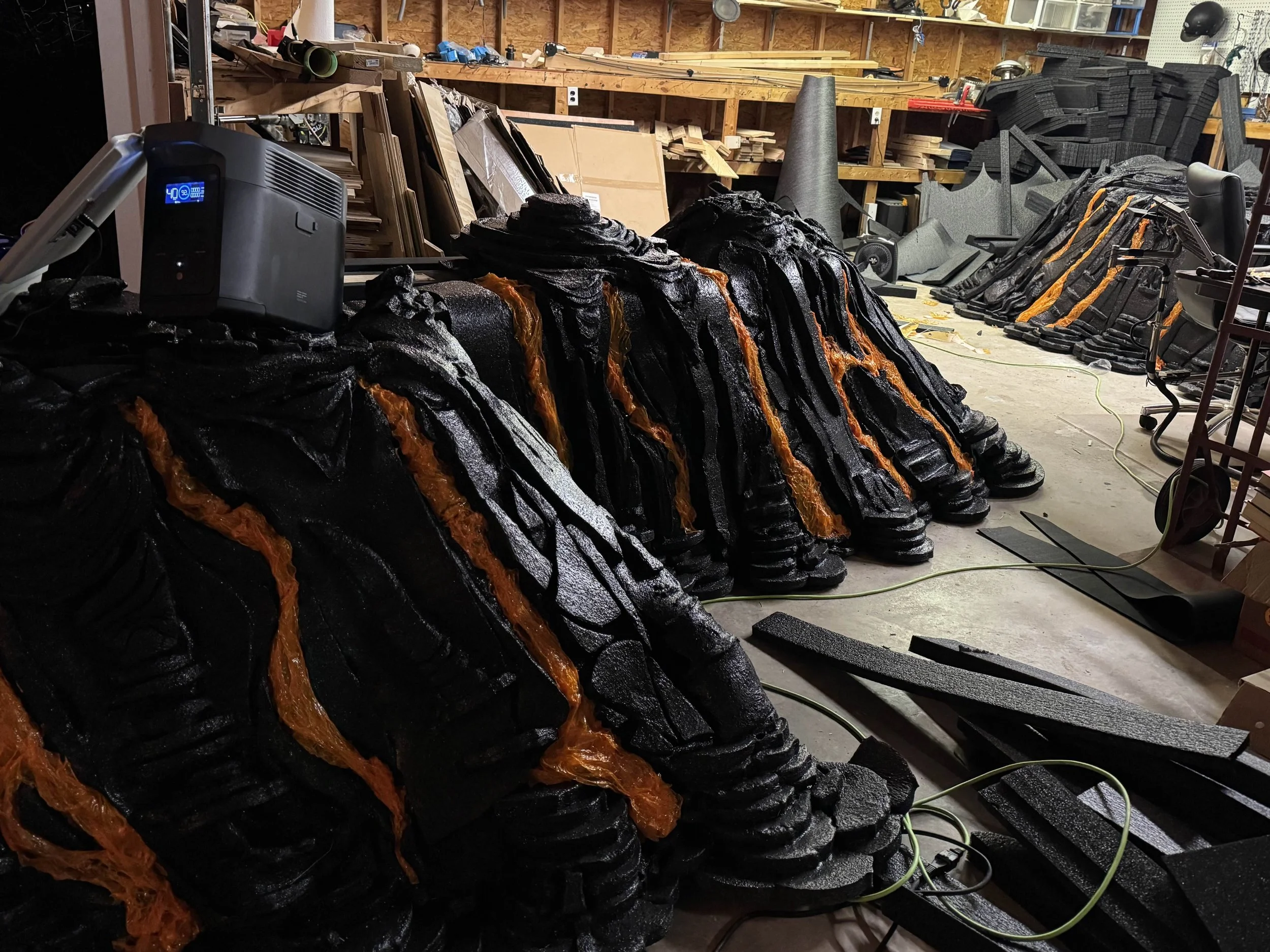 This weekend was a whirlwind of activity as we put the finishing touches on the South Gate. The lava detailing on the base took all of last week, and we were so excited to finally assemble the entire structure outside on Sunday in preparation for adding our final details. But Mother Nature had other plans! Rain poured down, cutting our detailing time short and forcing us to take everything apart and move it inside to the garage and carport. A big thank you to our friends Liz and Jarrett who pitched in for the final push.